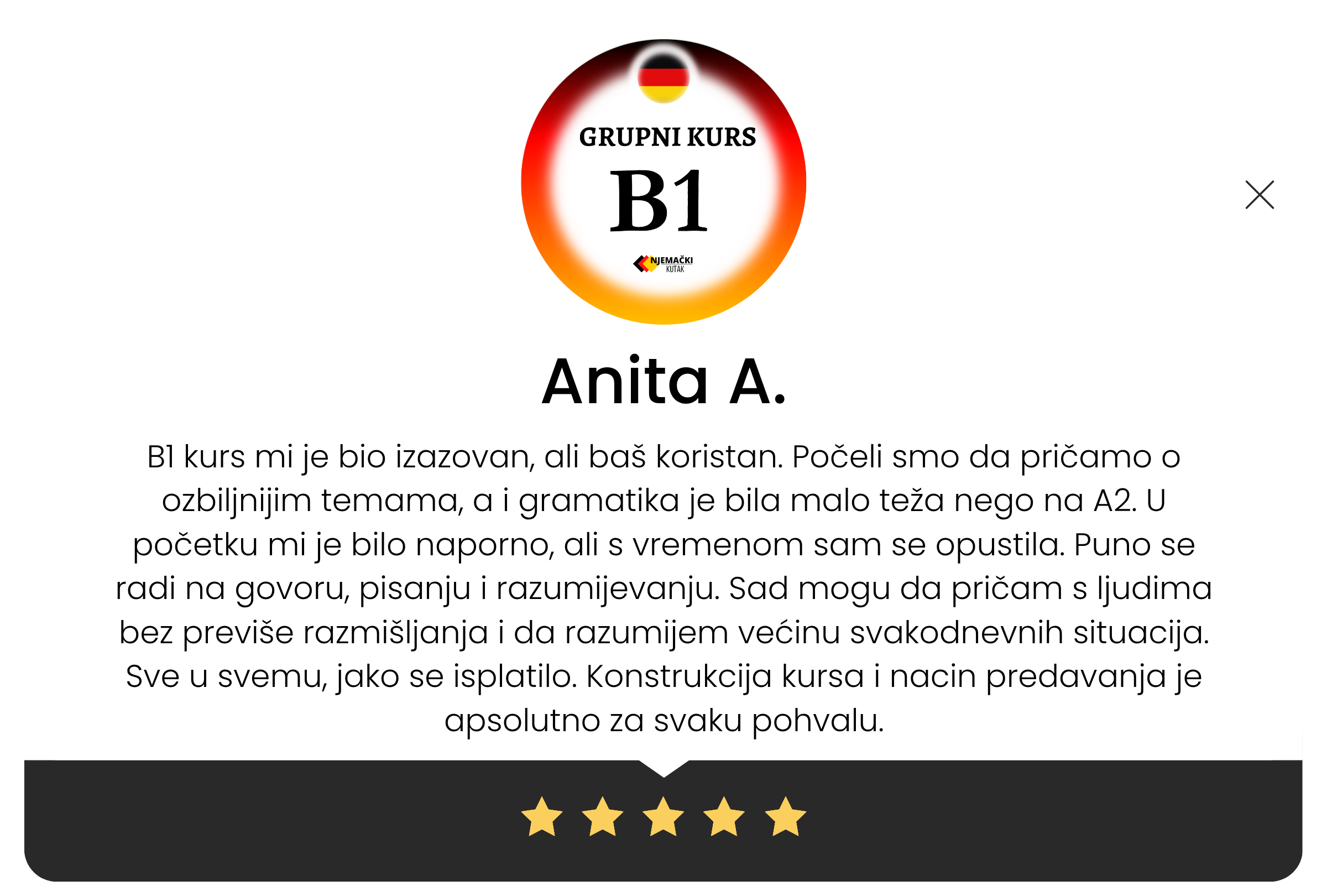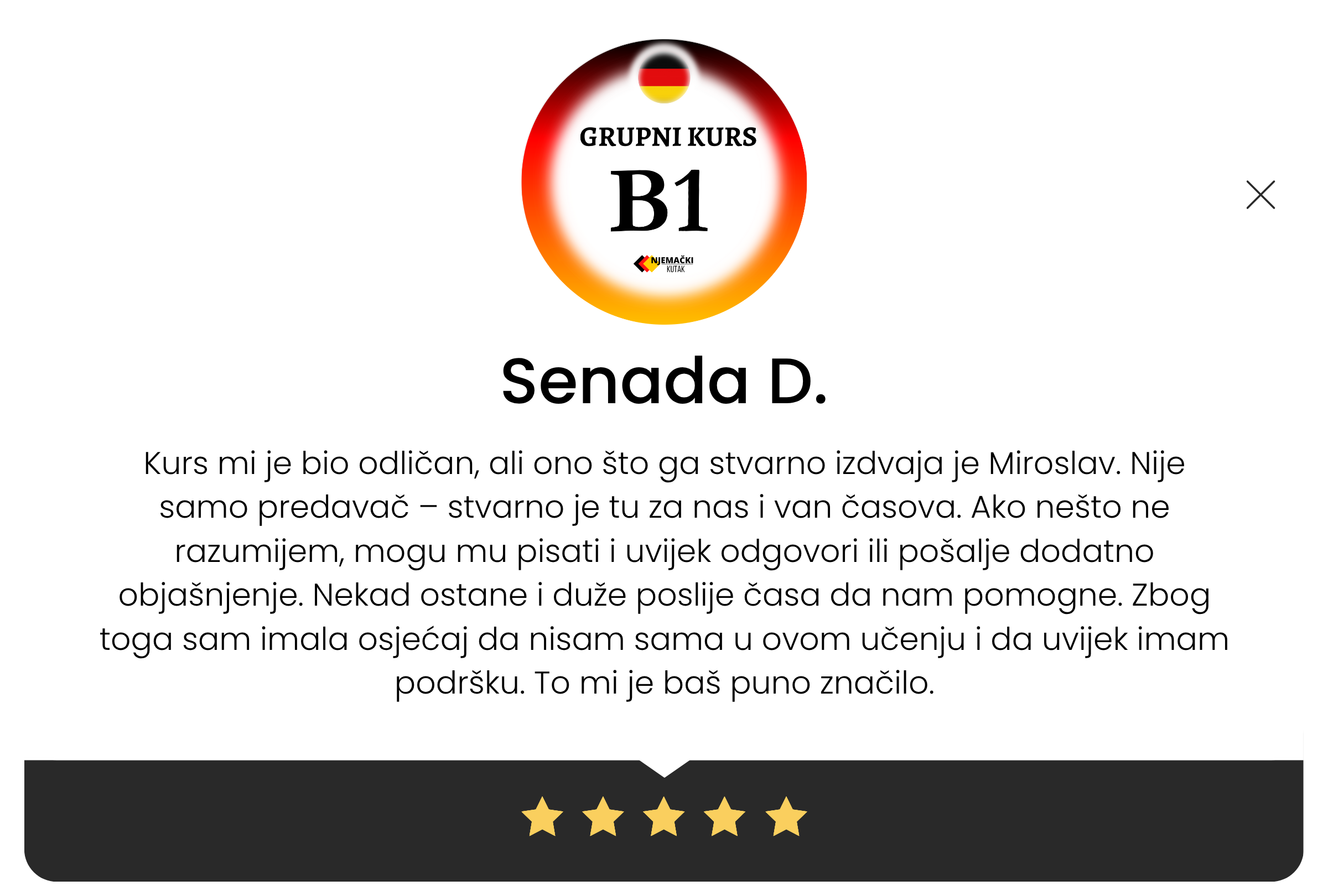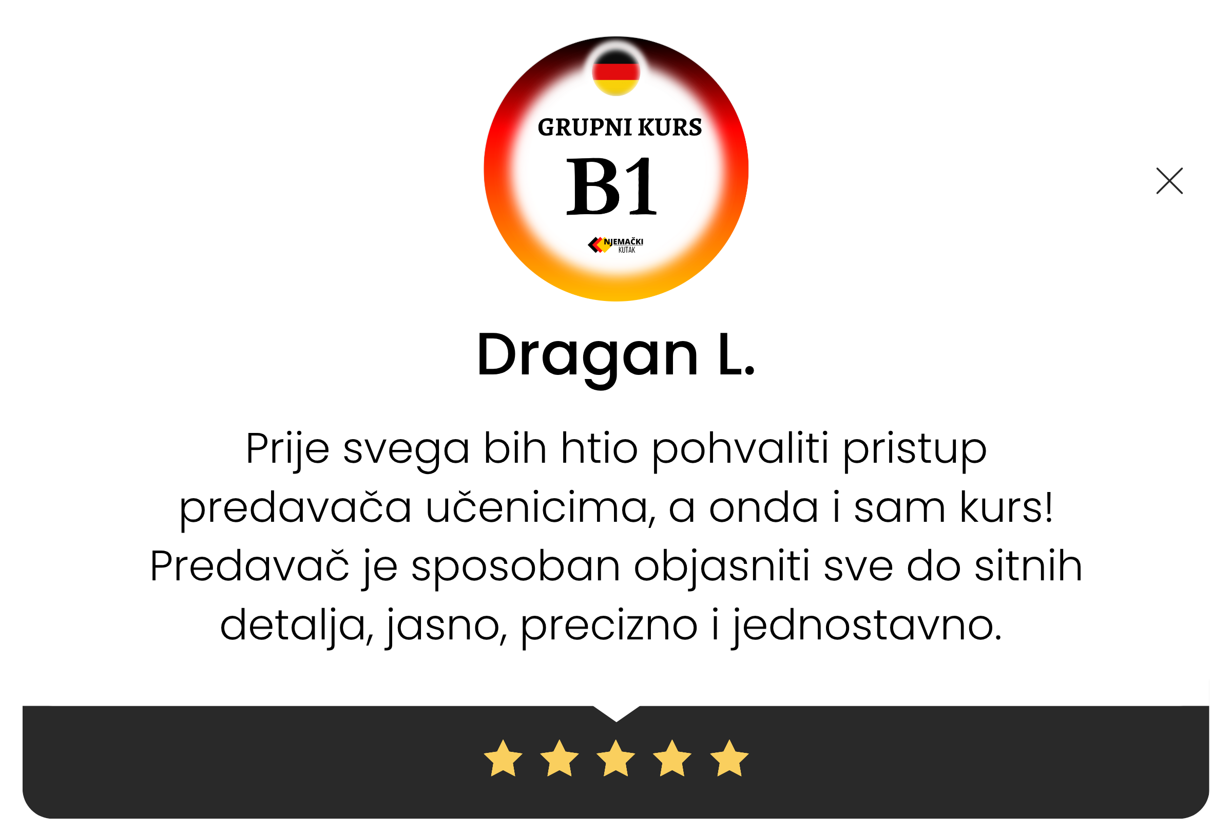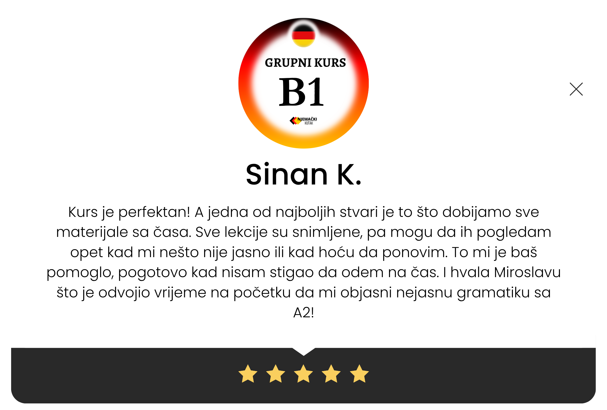 Na video časovima fokusiramo se na objašnjenje gramatike i usvajanje vokabulara, dok uživo časove koristimo da sve to vježbamo kroz komunikaciju, igre i interaktivne aktivnosti. Na taj način, svaki čas ima svoju svrhu – učiš precizno i sistematično, a istovremeno stavljamo akcenat na ono što ti je zapravo potrebno, a to je komunikacija!