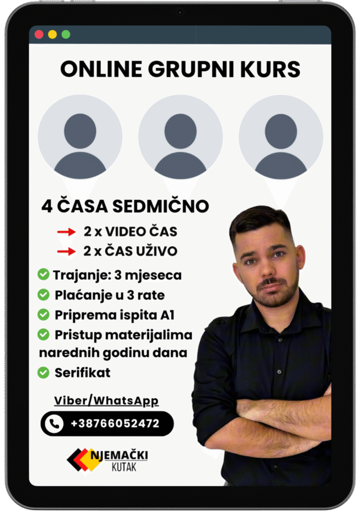 Ovaj kurs će te pripremiti za sve svakodnevne situacije i pomoći ti da tvoji prvi koraci u Njemačkoj budu sigurni i bez stresa.